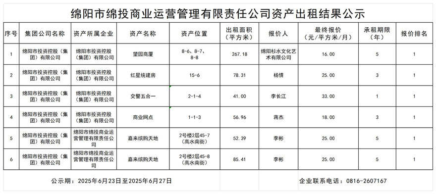 綿陽市綿投商業(yè)運營管理有限責任公司資產出租結果公示