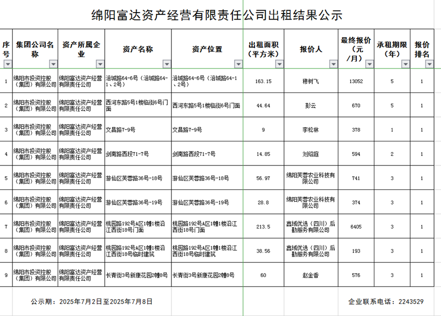 綿陽富達資產(chǎn)經(jīng)營有限責(zé)任公司出租結(jié)果公示