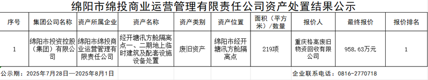 綿陽市綿投商業運營管理有限責任公司資產處置結果公示