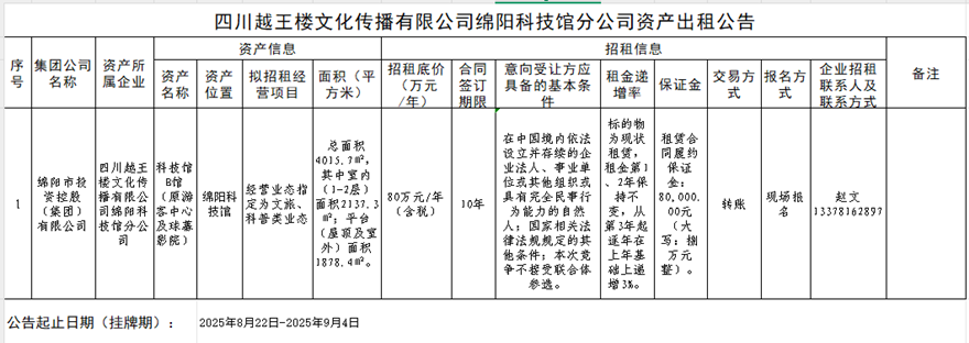 四川越王樓文化傳播有限公司綿陽科技城分公司資產出租公告