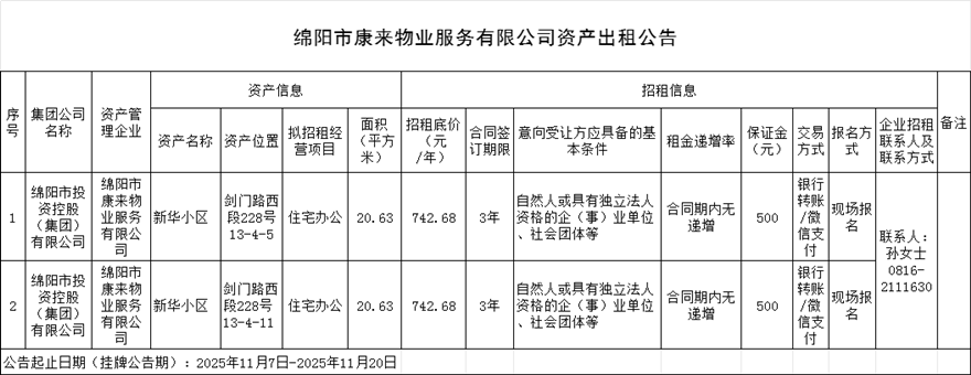 綿陽市康來物業(yè)服務有限公司資產(chǎn)出租公告