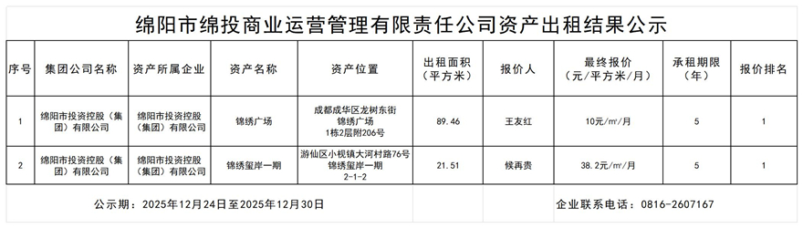 綿陽市綿投商業(yè)運營管理有限責任公司資產(chǎn)出租結果公示