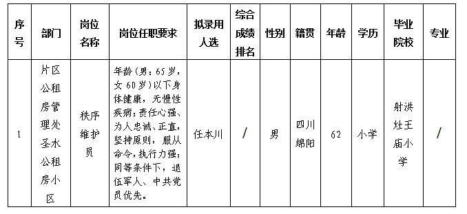 根據(jù)康居公司發(fā)布的長(zhǎng)期招聘一線勤雜人員的招聘公告相關(guān)規(guī)定,經(jīng)面試、體檢等程序,擬錄用任本川同志到綿陽(yáng)市康居房產(chǎn)經(jīng)營(yíng)管理有限公司片區(qū)公租房管理處圣水公租房小區(qū)工作,現(xiàn)予以公示,具體情況如下: