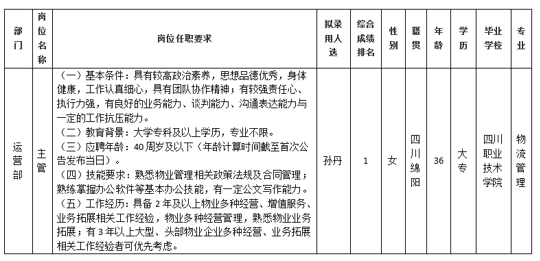 根據綿陽市康來物業服務有限公司發布的招聘公告及招聘相關規定,經筆試、面試、背景調查等程序,擬錄用孫丹同志到綿陽市康來物業服務有限公司運營部工作,現予以公示,具體情況如下: