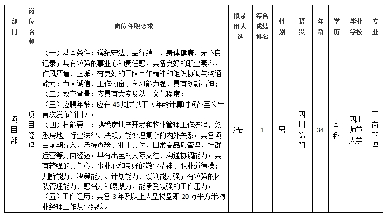 根據綿陽市康來物業服務有限公司發布的招聘公告及招聘相關規定,經筆試、面試、背景調查等程序,擬錄用馮超同志到綿陽市康來物業服務有限公司項目部工作,現予以公示,具體情況如下: