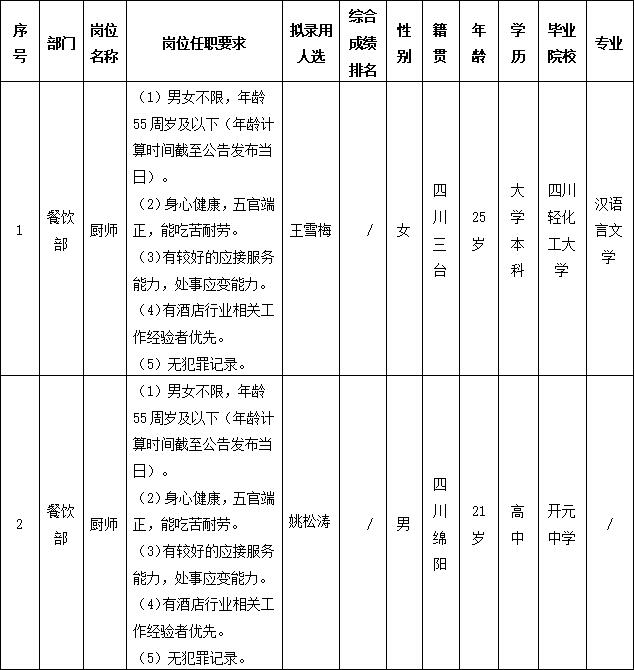 根據綿陽市東津酒店管理有限責任公司發布的招聘公告及招聘相關規定,通過面試等程序,擬錄用王雪梅等同志到餐飲部工作,現予以公示,具體情況如下: