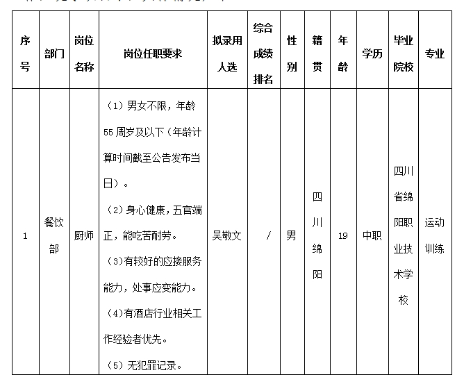 根據綿陽市東津酒店管理有限責任公司發布的招聘公告及招聘相關規定,通過面試等程序,擬錄用吳敬文同志到餐飲部工作,現予以公示,具體情況如下: