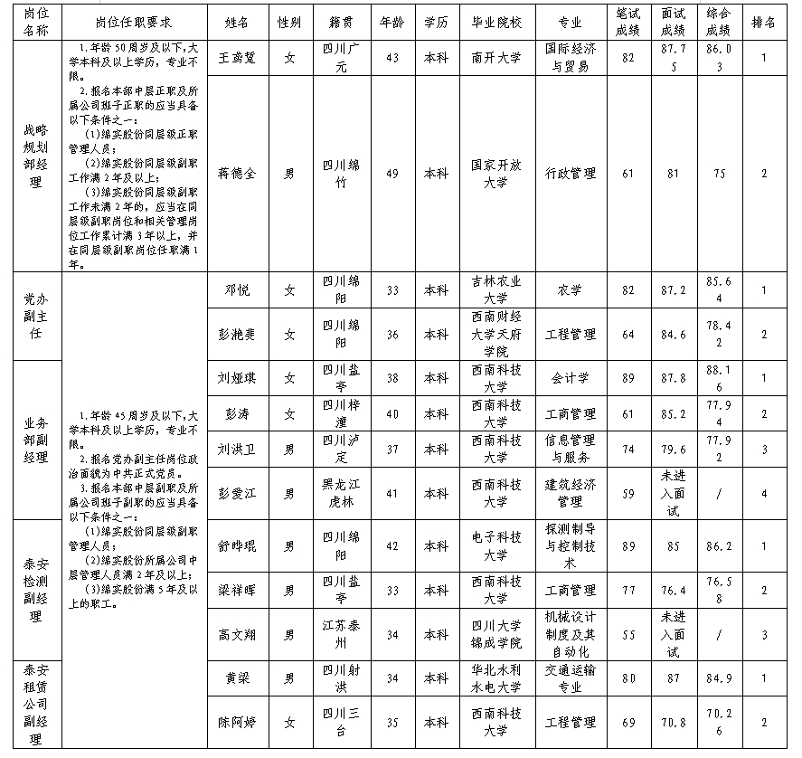 根據(jù)綿陽市汽車實(shí)驗(yàn)駕駛技術(shù)學(xué)校股份有限公司發(fā)布的內(nèi)部競(jìng)聘公告及內(nèi)部競(jìng)聘相關(guān)規(guī)定,經(jīng)筆試、面試等程序,現(xiàn)將內(nèi)部競(jìng)聘成績(jī)予以公示。