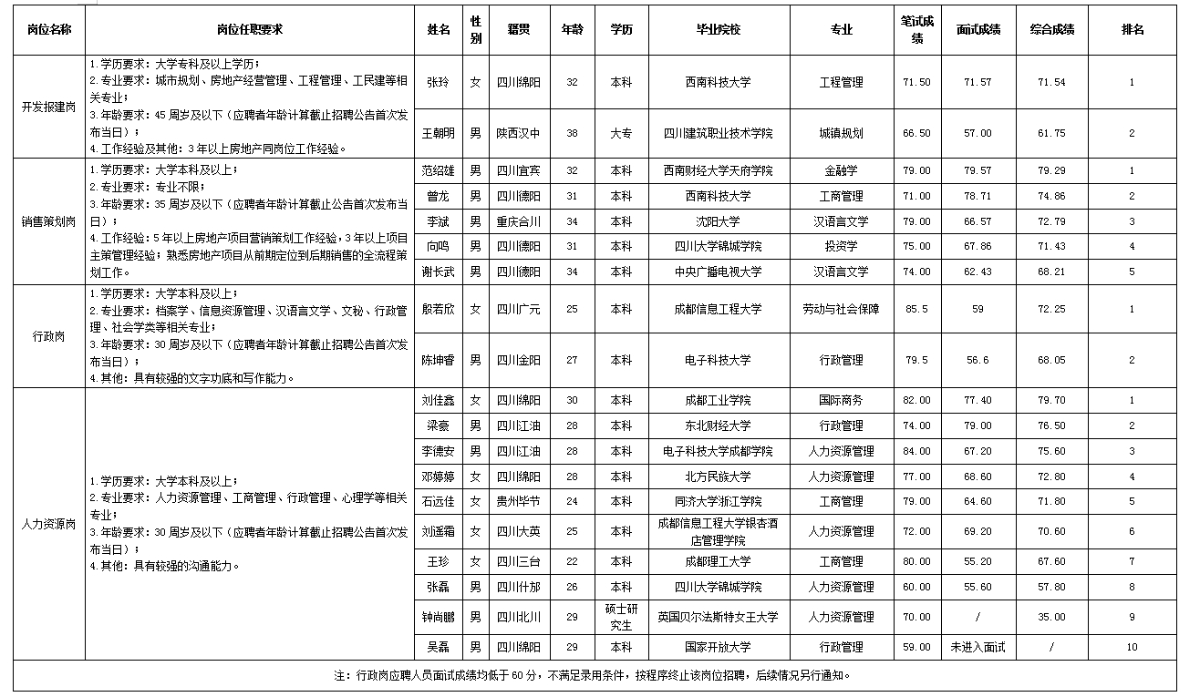 根據綿陽市綿投置地有限公司發(fā)布的招聘公告及招聘相關規(guī)定,經筆試、面試等程序,現將筆試、面試成績予以公示。