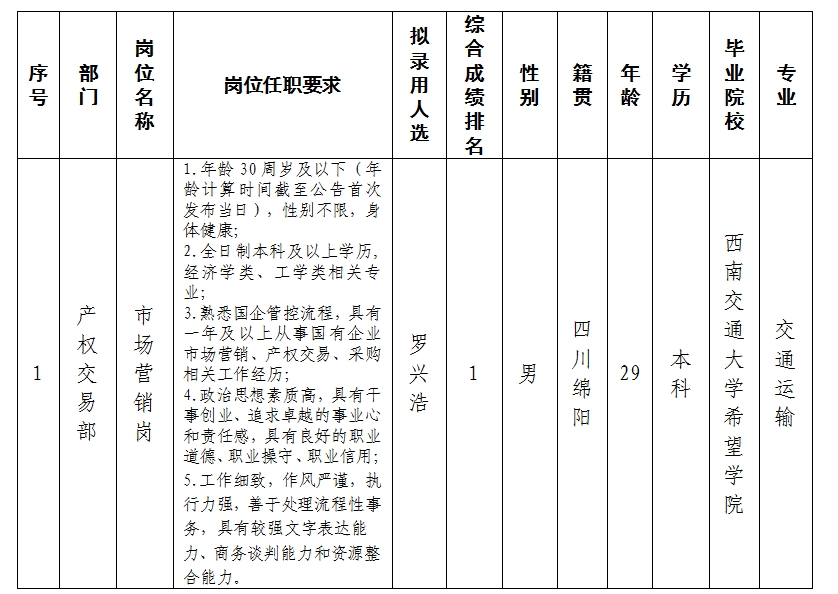 根據綿陽市綿投商業運營管理有限責任公司發布的招聘公告及招聘相關規定,經筆試、面試、考察、體檢等程序,擬錄用羅興浩同志到產權交易部工作,現予以公示,具體情況如下: