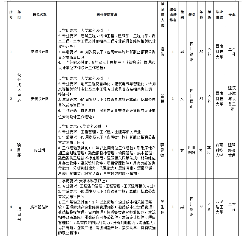 根據綿陽市綿投置地有限公司發布的招聘公告及招聘相關規定,經筆試、面試、考察、體檢等程序,擬錄用謝偉等4名同志到綿陽市綿投置地有限公司工作,現予以公示,具體情況如下: