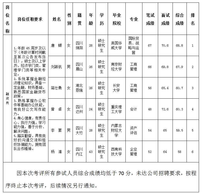 根據(jù)綿陽金控投資管理有限責(zé)任公司發(fā)布的招聘公告及招聘相關(guān)規(guī)定,經(jīng)筆試、面試等程序,現(xiàn)將筆試(面試)成績予以公示。