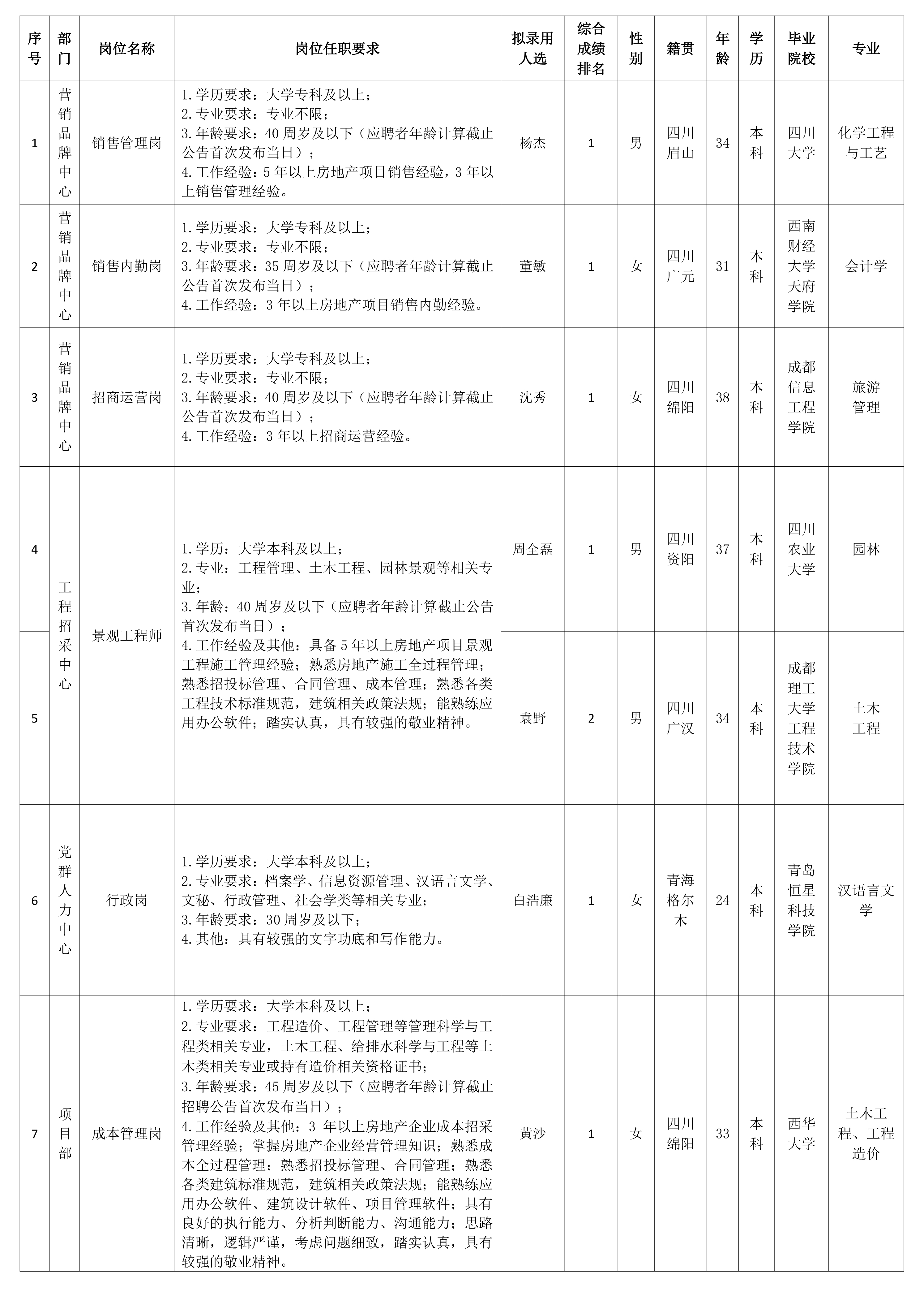根據綿陽市綿投置地有限公司發布的招聘公告及招聘相關規定,經筆試、面試、考察、體檢等程序,擬錄用楊杰等同志到綿陽市綿投置地有限公司工作,現予以公示,具體情況如下:
