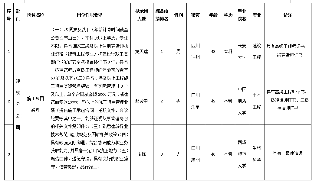 根據(jù)四川嘉來(lái)建筑工程有限公司發(fā)布的招聘公告及招聘相關(guān)規(guī)定,經(jīng)筆試、面試、考察、體檢等程序,擬錄用龍?zhí)旖ā⑧u賢中、周棟同志到四川嘉來(lái)建筑工程有限公司工作,現(xiàn)予以公示,具體情況如下: