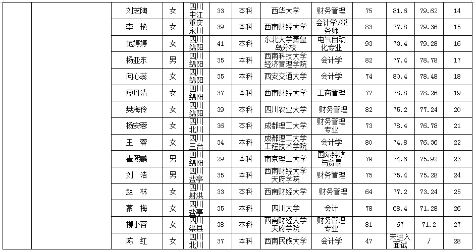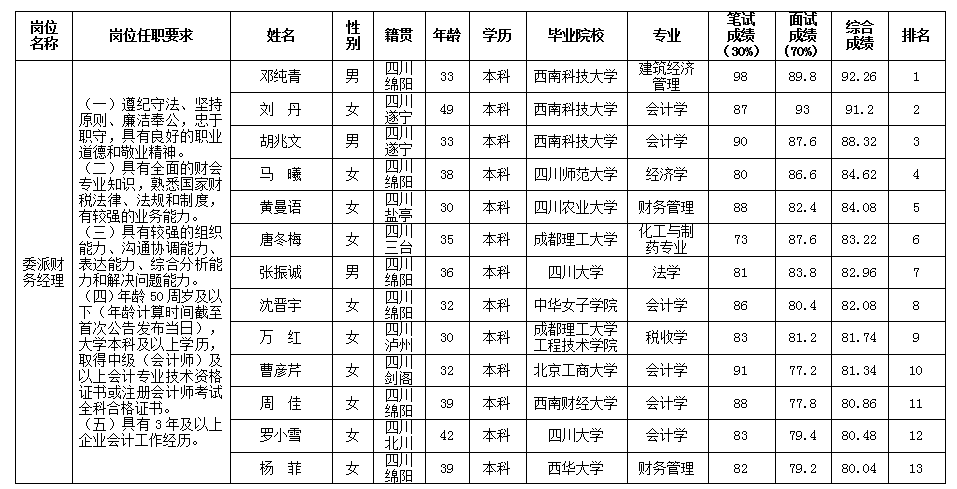 根據綿陽市投資控股(集團)有限公司發布的招聘公告及招聘相關規定,經筆試、面試等程序,現將筆試(面試)成績予以公示。
