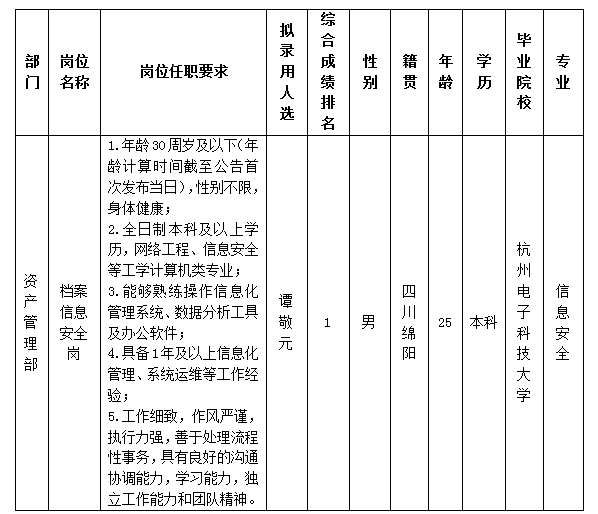 根據綿陽市綿投商業運營管理有限責任公司發布的招聘公告及招聘相關規定,經筆試、面試、背景調查、體檢等程序,擬錄用譚敬元同志到綿陽市綿投商業運營管理有限責任公司工作,現予以公示,具體情況如下: