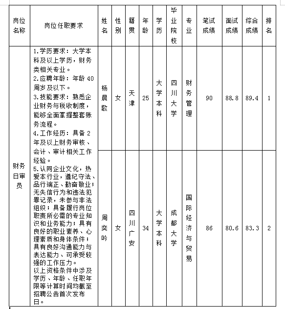 根據綿陽富樂山九洲國際酒店有限公司關于財務日審員招聘公告及招聘相關規定,經筆試、面試等程序,現將招聘成績予以公示。