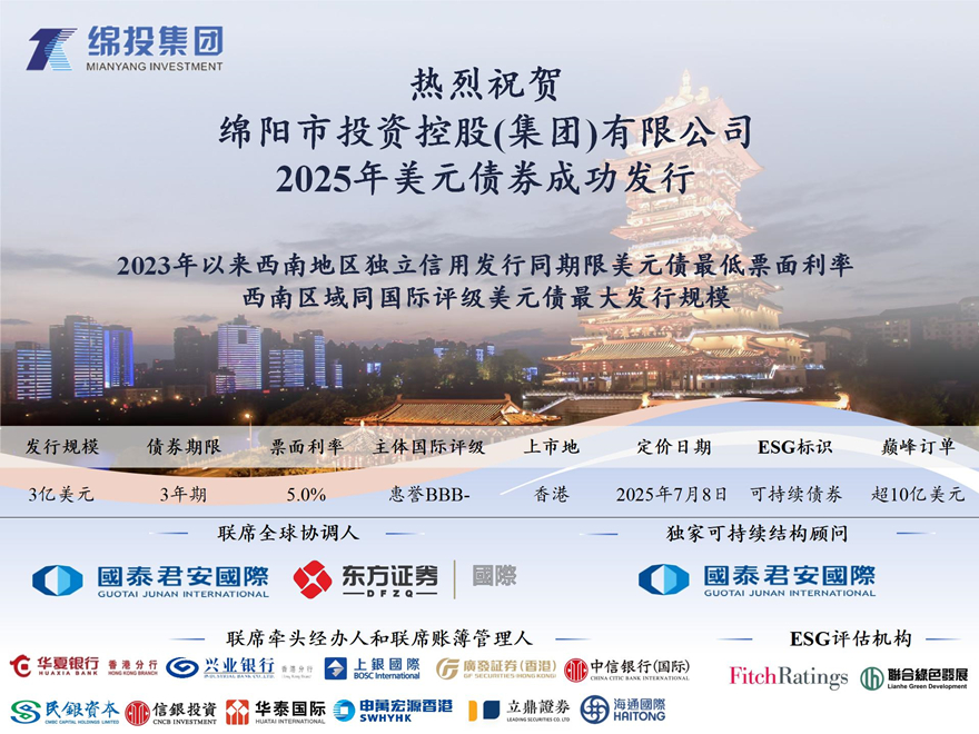 7月8日,綿投集團成功定價發行3億美元、3年期可持續美元債券,認購倍數3.43倍(峰值訂單超10億美元),最終票面利率強勢鎖定5.00%,較初始價格指引大幅收窄70個基點,創2023年以來西南地區獨立信用發行同期限境外美元債最低票面利率、西南區域同國際評級美元債最大發行規模,以及創2025年以來中資投資級地方國企美元債最大收窄幅度。