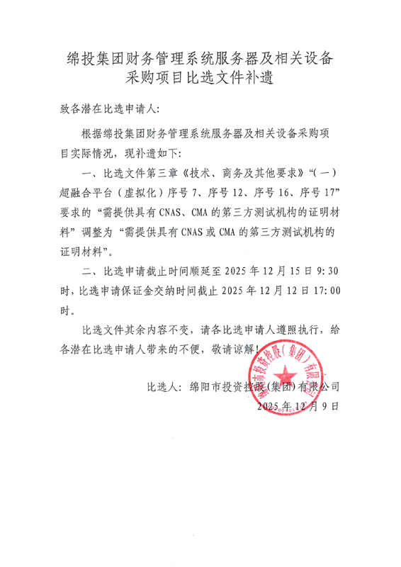 綿投集團財務管理系統服務器及相關設備采購項目比選文件補遺