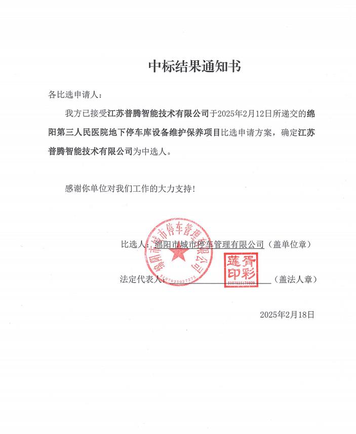綿陽第三人民醫(yī)院地下停車庫設(shè)備維護(hù)保養(yǎng)項目中標(biāo)結(jié)果通知書