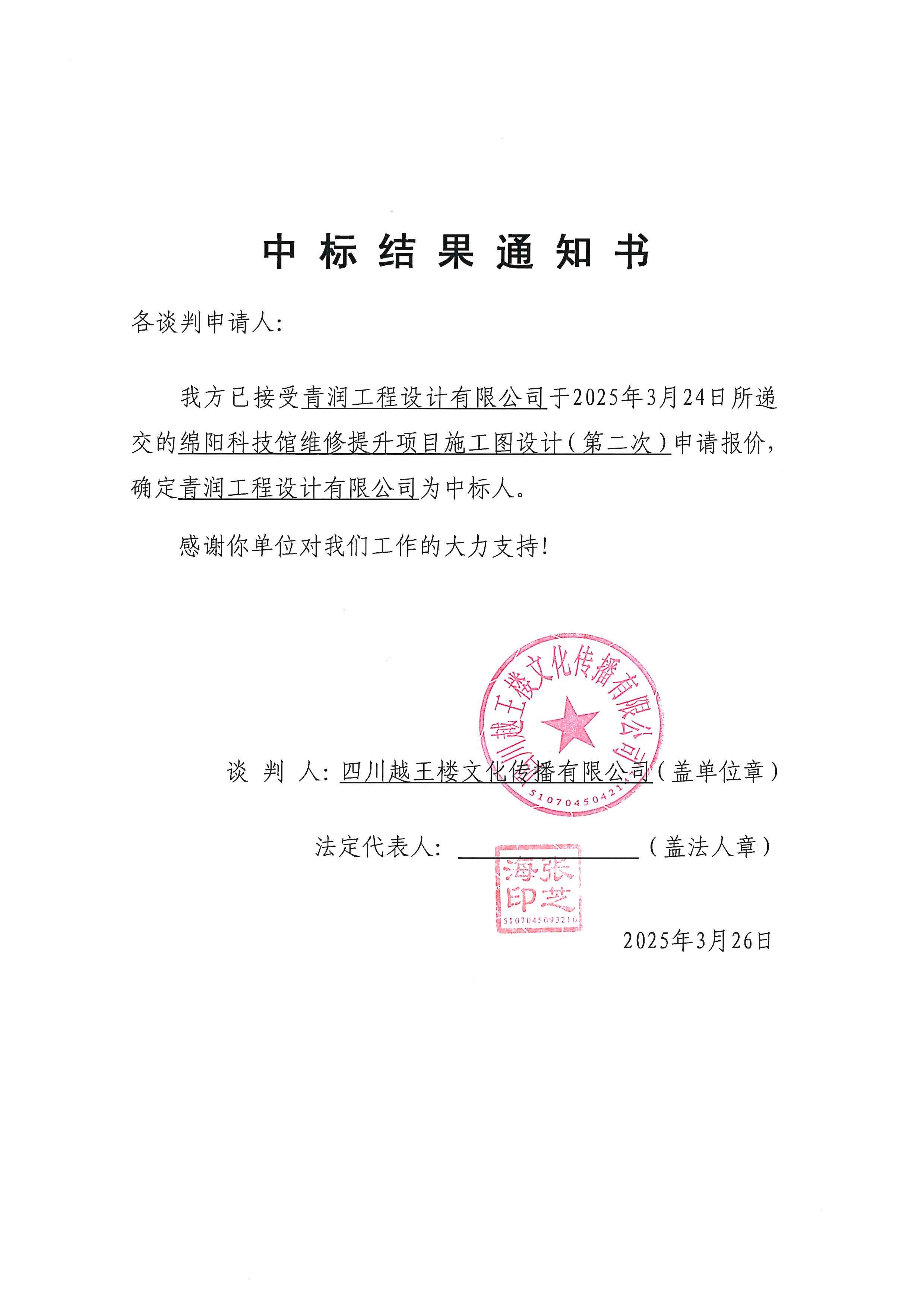 綿陽科技館維修提升項(xiàng)目施工圖設(shè)計(jì)(第二次)競爭性談判結(jié)果公告