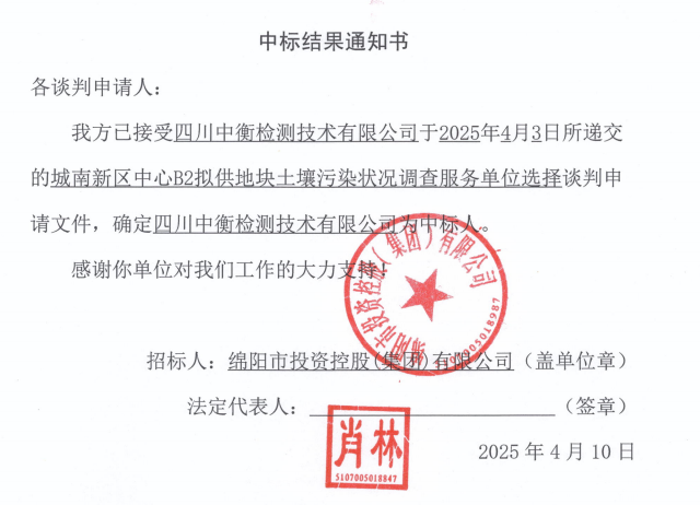城南新區中心B2擬供地塊土壤污染狀況調查服務單位選擇中標結果通知書