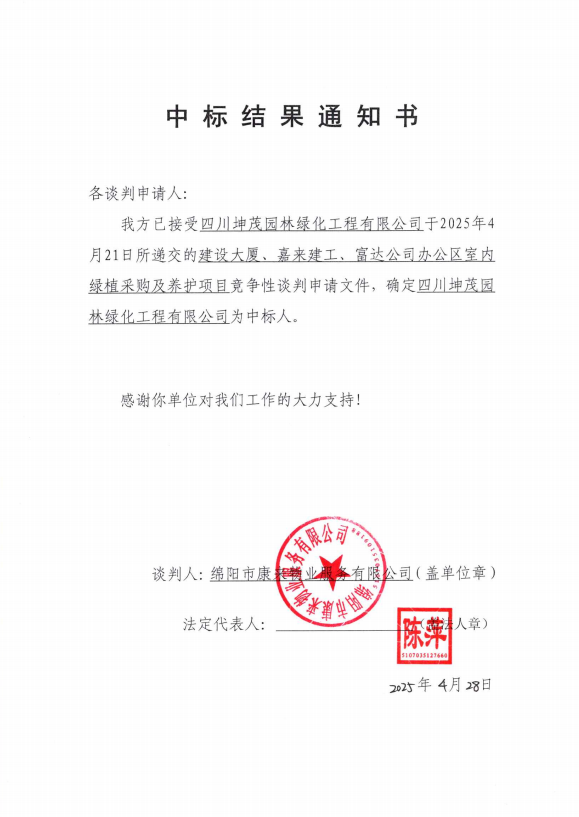 建設大廈、嘉來建工、富達公司辦公區室內綠植采購及養護項目中標結果通知
