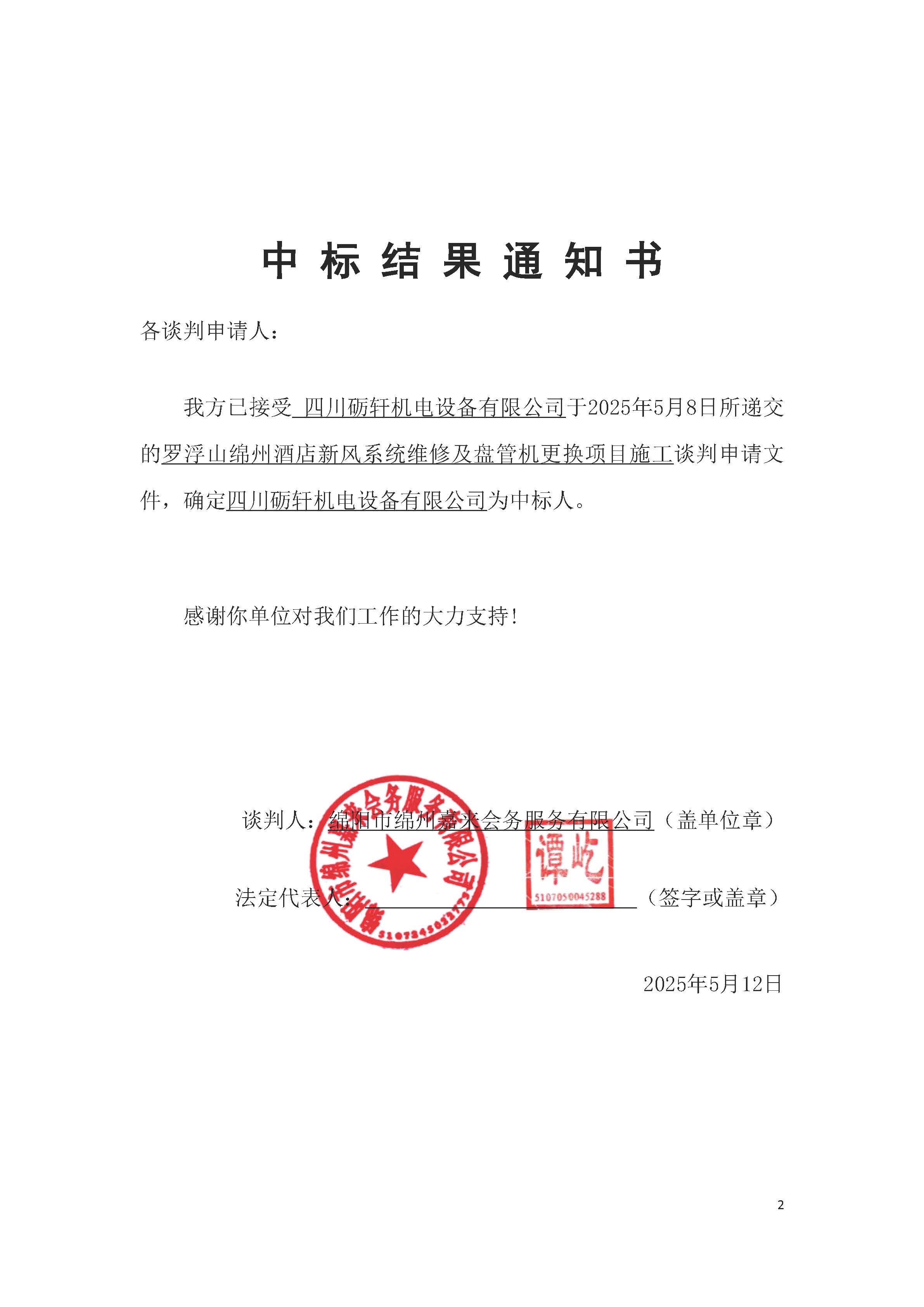 羅浮山綿州酒店新風系統維修及盤管機更換項目施工中標結果通知